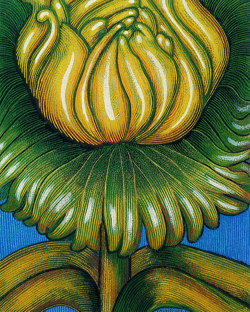 Pour remplir les formes, la ligne d'Emma Reyes s'ordonne en segments parallèles qui ondulent ou restent droits, quand ils ne tournent pas sur eux mêmes en spirales très vastes de facture intriquée. On dirait qu'elle ne conçoit pas un plan comme une surface délimitée à l'extérieur par une ligne de contours mais comme des files de lignes en succession infinie. L'emploi qu'elle fait de la ligne est semblable à celui que Pollock fait du "dripping". Comme lui, elle sait où elle va commencer, mais non où elle va terminer : Elle ne sait pas les développements qui vont se produire au cours de l'exécution sans doute y-a-t-il un haut degré d'improvisation dans lequel comptent les accidents, improvisation qui à la fin peut déboucher sur des échecs sans appel ou sur des œuvres superbes.